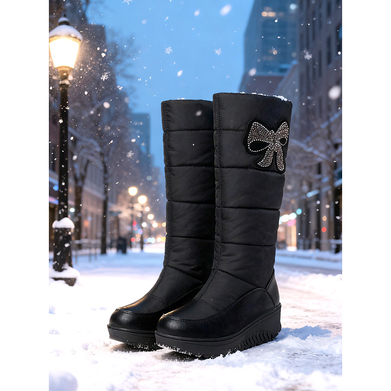 Women's Waterproof Winter Boots - Red Quilted Snow Boots with Bow and Rhinestone Detail, Slip-Resistant Sole, Ideal for Snowy Weather, Outdoor Activities and Casual Winter Wear