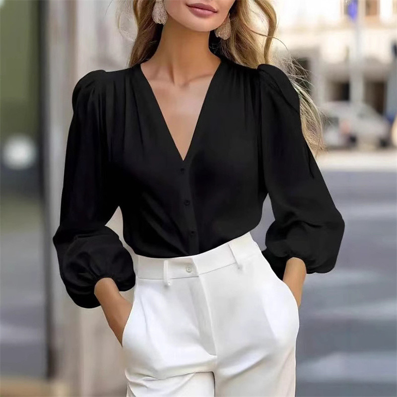 Women's Blouse Dressy Tops Plain Elegant Vintage Ladies Long Sleeve Puff Sleeve Crew Neck Regular Tops Work Daily Holiday Ruched Buttons Draped Black Wine Royal Blue Brown Green Fall Winter