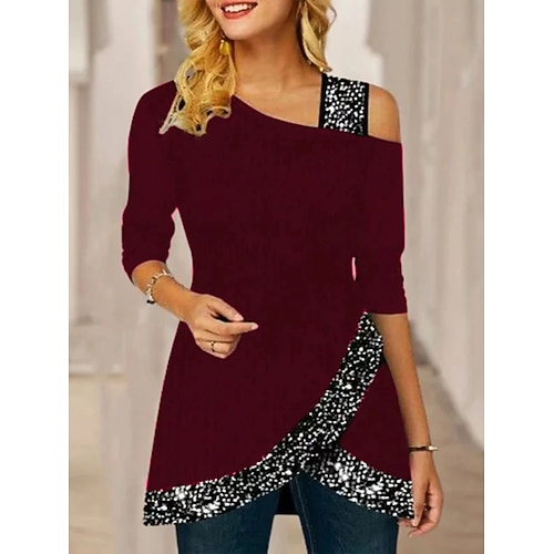 Per donna Blusa Tinta unica Elegante Casual Manica Lunga Top con spalle scoperte Top Regolari Quotidiano Paillettes Patchwork Nero Vino Blu marino Primavera Autunno