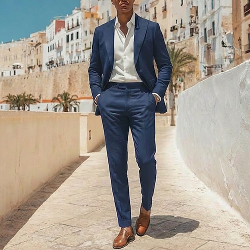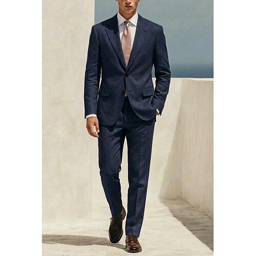 Uomo Completi in Lino Abiti da lavoro Matrimonio primaverile Balli di fine anno Nero Blu marino Primavera Tuta Bavero classico Leggero Formale Tinta unita Vestibilità su misura 2 pezzi Monopetto Due
