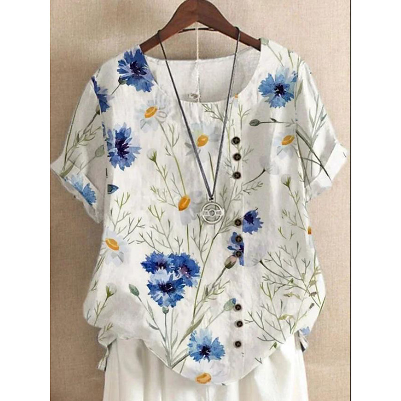 Women's Shirt Blouse Floral Graphic Leaf Elegant Daily Beach Short Sleeve Crew Neck Regular Tops Daily Holiday Linen Like Print Navy Blue Blue Green Light Blue Summer