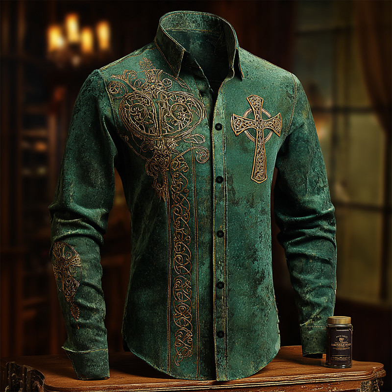 St. Patrick's Day Men's Celtic Cross Celtic Art Shirt Button Up Shirt Long Sleeve Vintage Retro Party Holiday Spring Fall Turndown 3D Print Linen Like Shirt Green