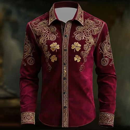 St. Patrick's Day Herren Vierblättriger Kleeblatt Shamrock Keltische Kunst Hemd Button Up Hemd Langarm Vintage Retro Feiertag Frühling Herbst Umgeschlagen 3D Druck Leinenähnliches Hemd Grün 1