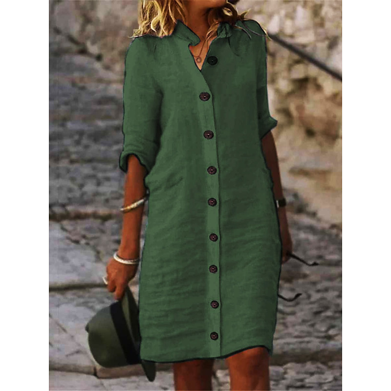 Women's Black White Green Summer Spring Fall Midi Dress Linen-Inspired Dresses Shirt Dress Casual Dress Fashion Basic Casual Outdoor Daily Regular Fit Plain Shirt Collar