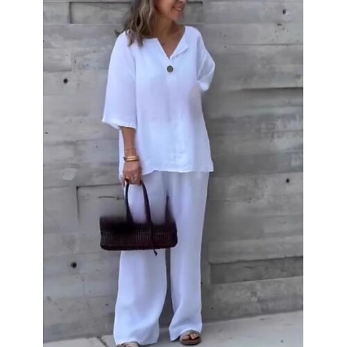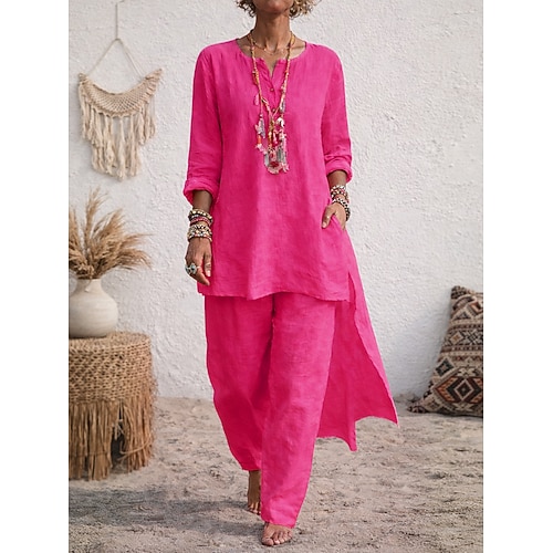 Set di camicie boho da donna, due pezzi in simil lino, pantaloni a gamba larga in lino e cotone sintetico, maniche lunghe, scollo a V, tinta unita, moda streetwear, casual, quotidiano, blu, nero, bianco, estivo, vestibilità regolare.
