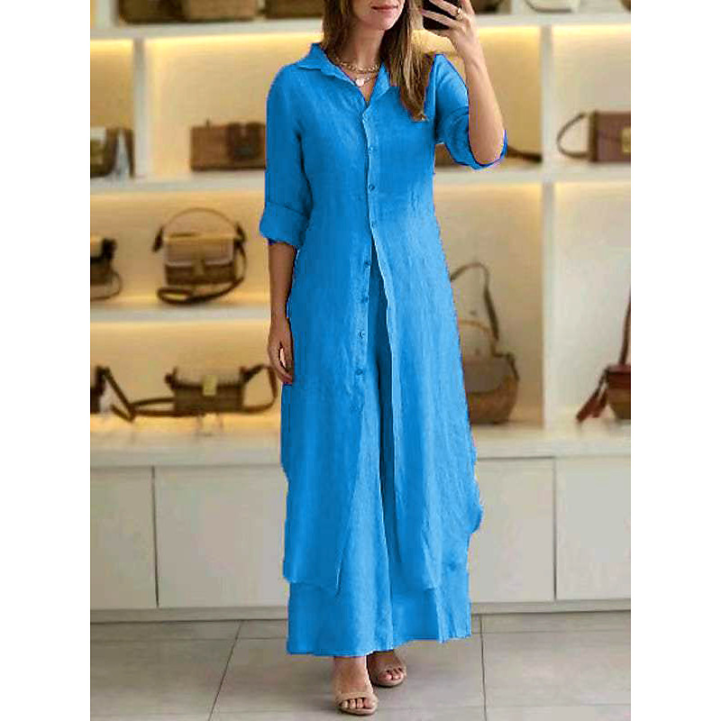 Women's Fashion Streetwear Daily Shirt Linen-Inspired Sets Two Piece Sets Skirt Long Sleeve Shirt Collar Plain Patchwork Casual Daily Red Sky Blue Khaki Fall Regular Fit