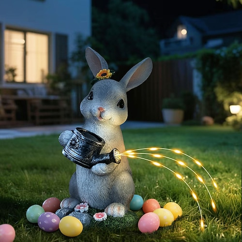 Osterhasen-Gießkanne aus wasserfestem, grauem Kunstharz mit Solarbeleuchtung für den Außenbereich, ideal für Garten, Hof, Wege und Rasen, auch als dekorative Akzentbeleuchtung für die Gartengestaltung