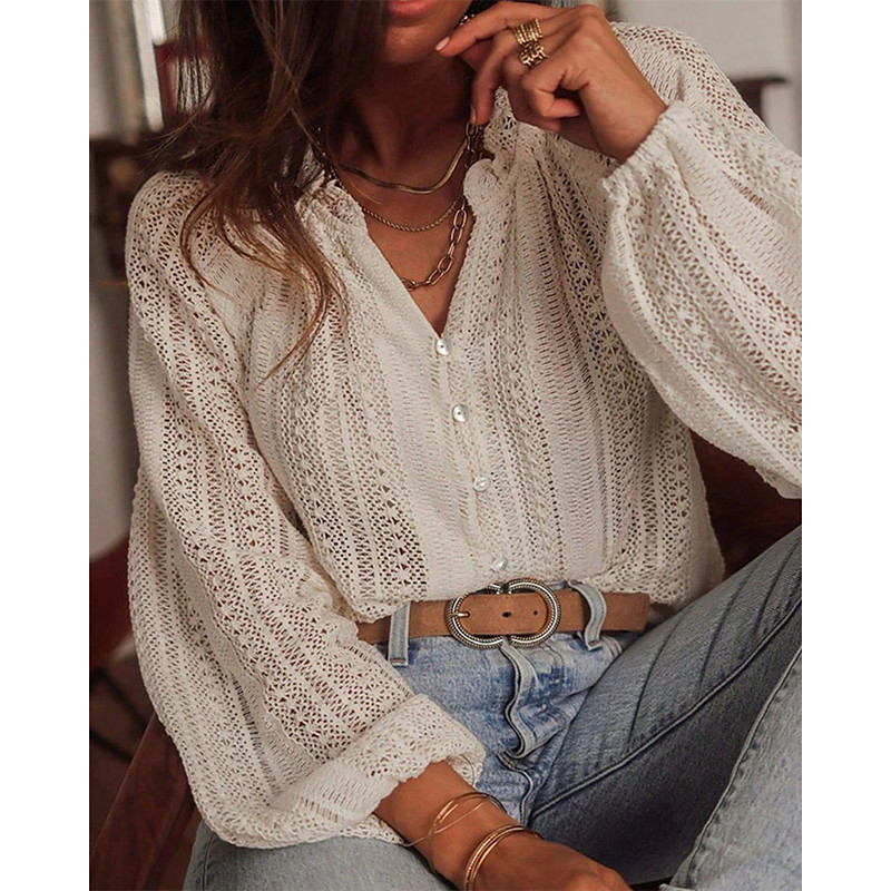 Women's White Elegant Lace Tops Eyelet Blouse Dressy Tops Elegant Lace Buttons Long Sleeve Crew Neck Daily Romantic Petite Tops Summer Holiday Wear Pink Khaki Summer Semi Formal Blouses