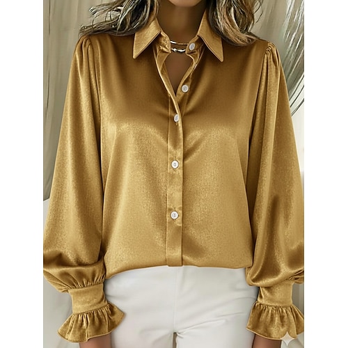 Per donna Camicia Elegant Elegante Raso/Satin Semplice Moderno Casual Manica Lunga Colletto a Camicia Top Regolari Quotidiano Uscire Arricciato Blu Nero Vino Blu marino Cachi Autunno