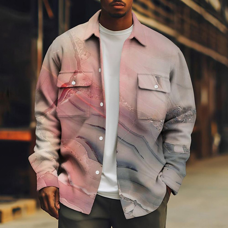 Men's Marble Abstract Liquid Art Corduroy Shirt Shacket Shirt Jacket Long Sleeve Casual Outdoor Dailywear Fall Winter Turndown Button-Down Warm Jacket with Flap Pockets Pink Green