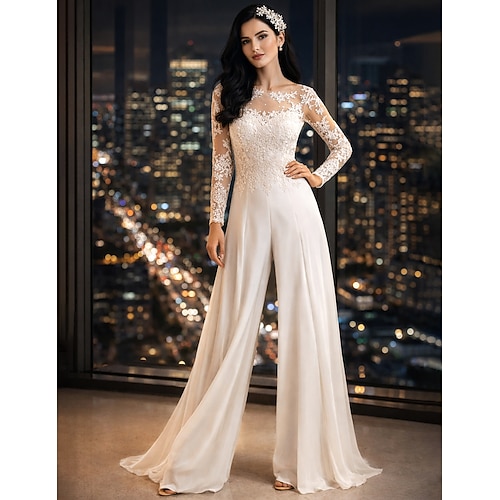 Matrimonio in spiaggia Abiti da cerimonia casual Gonne a tuta Collo illusion Maniche lunghe Lunghezza fino al pavimento Chiffon Abiti da sposa con Applicazioni