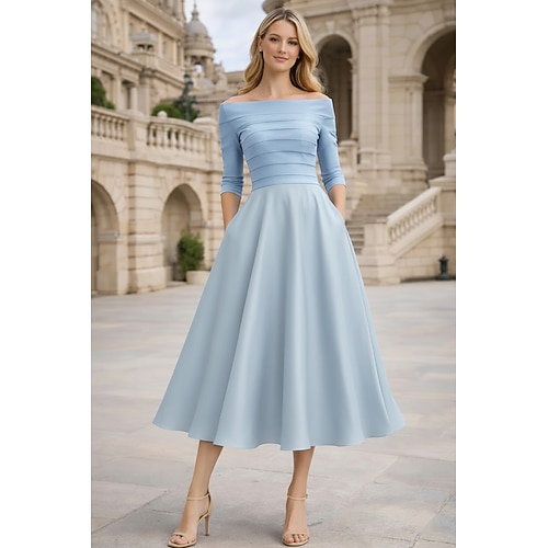Linea ad A Lunghezza Tè Abiti da Cocktail Elegante Manica 3/4 Senza Spalle Festa in giardino Matrimonio Chiffon Raso con Pieghe