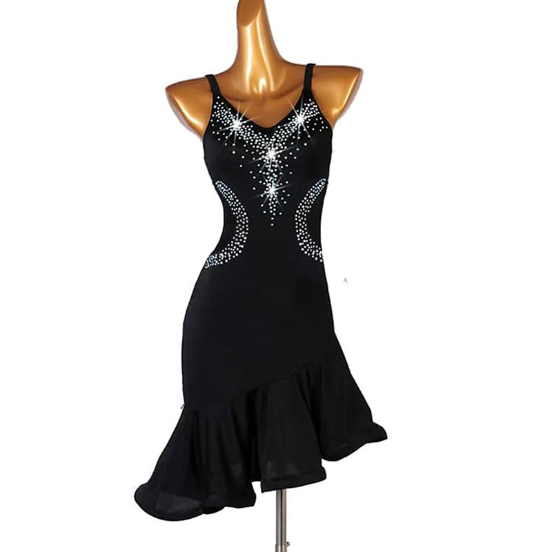 Latin Salsa Dance Dress Rhinestone Ruffles Tassel Women's Performance Training Sleeveless Spandex Lace