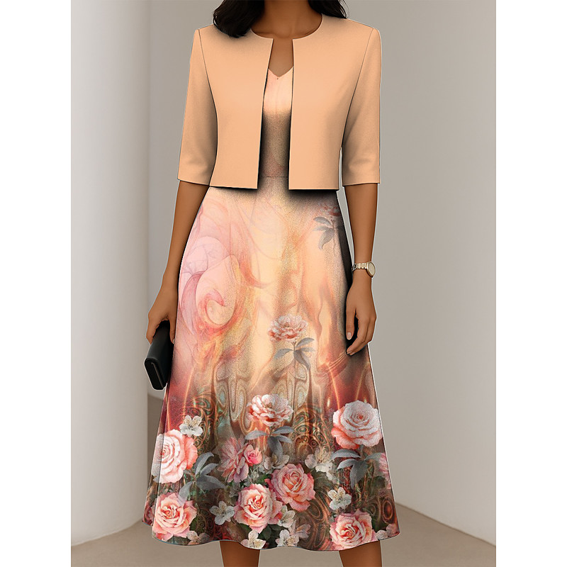 Women's Two Piece Dress Sets Midi Dress with Jacket Elegant A Line Dress Half Sleeve Casual Dress Chiffon Dress Swing Dress Floral Print V Neck Date Beige Spring Regular Fit