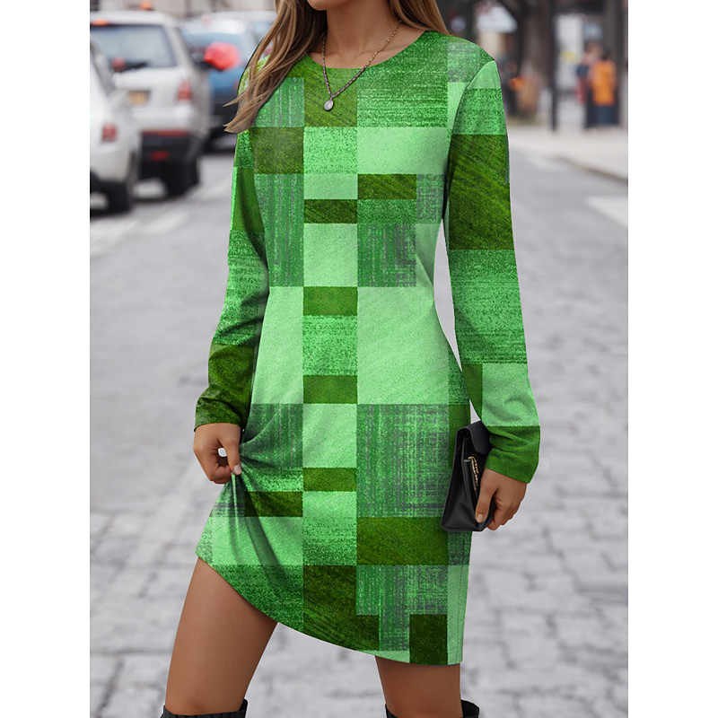 Women's Mini Dress Sheath Dress A Line Dress Fit And Flare Dress Party Casual Boho Party Wedding Guest Daily Regular Fit Graphic Geometric Plaid Long Sleeve Crew Neck Blue Purple Green Gray Spring