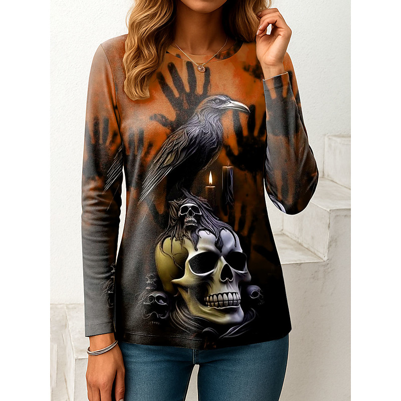 Women's T Shirt Skulls Graphic Vintage Fashion Stylish Long Sleeve Crew Neck Regular Tops Daily Weekend Print Pink Red Blue Orange Green Spring Fall Winter