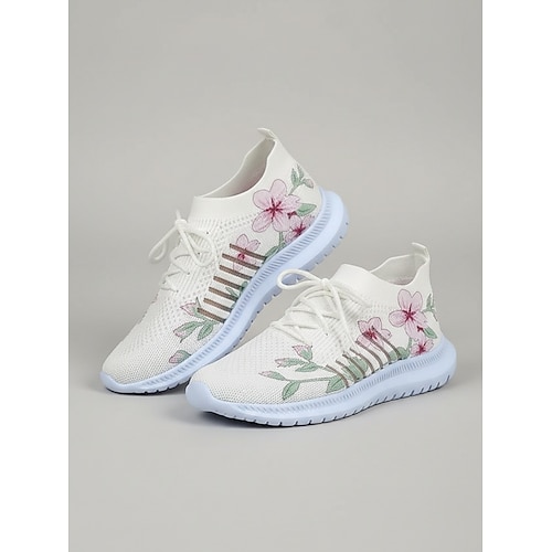 Sneakers Flyknit da donna bianche con stampa floreale: scarpe sportive traspiranti e leggere, ideali per camminare, viaggiare, andare in palestra e per tutti i giorni.