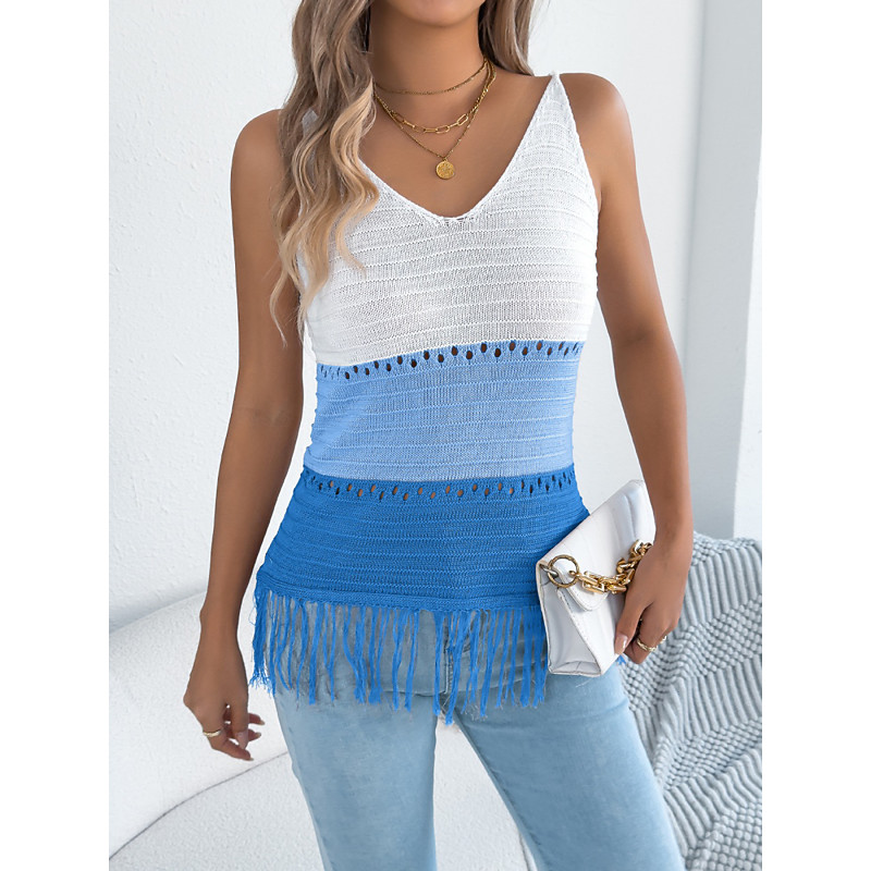 Women's Ribbed Knit Tops Tank Top Tee Top Color Block Fashion Stylish Classic Sleeveless V Neck Regular Tops Daily Going out Weekend Tassel Blue Orange Khaki Summer Spring