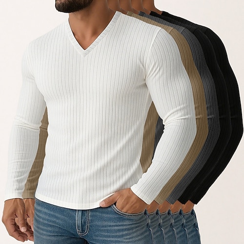 Herren T Shirt Geripptes Strick-T-Shirt T-Shirt Langarmshirt Langarm V Ausschnitt Frühling Herbst Winter Einfach Vertikale Streifen Grubenstreifen Mode Designer Basic 5-Stücke Mehrfachpackung Urlaub
