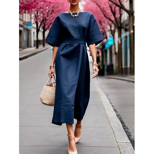 Per donna Abito lungo maxi Abiti in cotone e lino Vestito Casual Moda Essenziale Moderno Quotidiano Vacanza Uscire Vestibilità comoda Semplice Manica 3/4 Girocollo Blu Rosa Rosso Verde Primavera