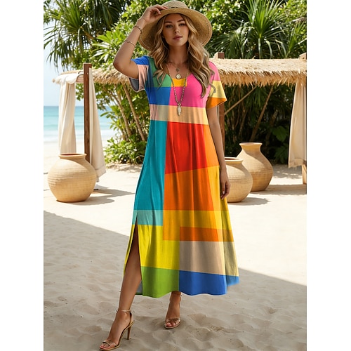 Per donna Abito Midi Abito a trapezio Vacanza Casual Spiaggia Ferie Data Vestibilità comoda Grafico Astratto Manica Corta Girocollo Blu Giallo Viola Arancione Estate Primavera