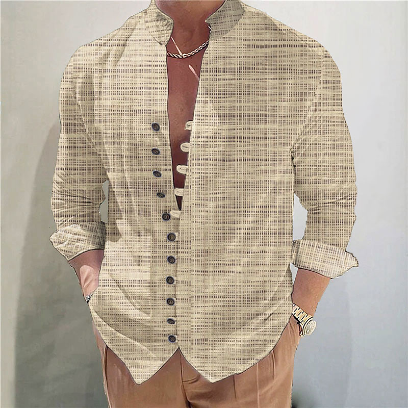 Men's Geometric Line Shirt Stand Collar Shirt Long Sleeve Casual Vacation Daily Wear Going out Spring Fall Mandarin Collar Band Collar Button-Down Linen Like Shirt Blue Light Purple Green Khaki