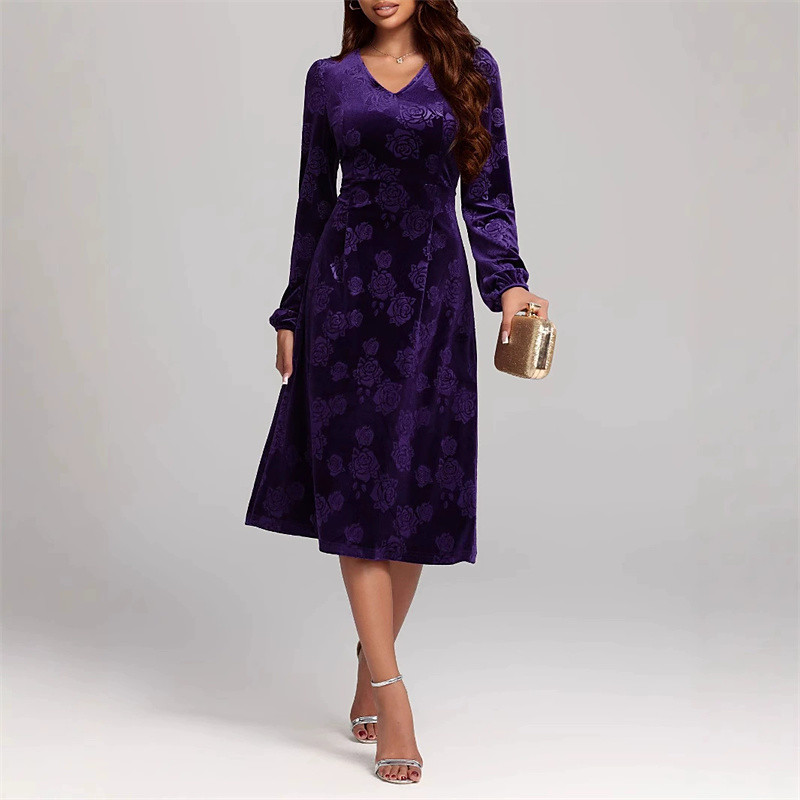 Women's Midi Dress Christmas Dress Velvet Dress Cocktail Dress Elegant Fashion Modern Outdoor Party Party Evening Wear Regular Fit Floral Plain Long Sleeve V Neck Red Purple Green Spring Autumn