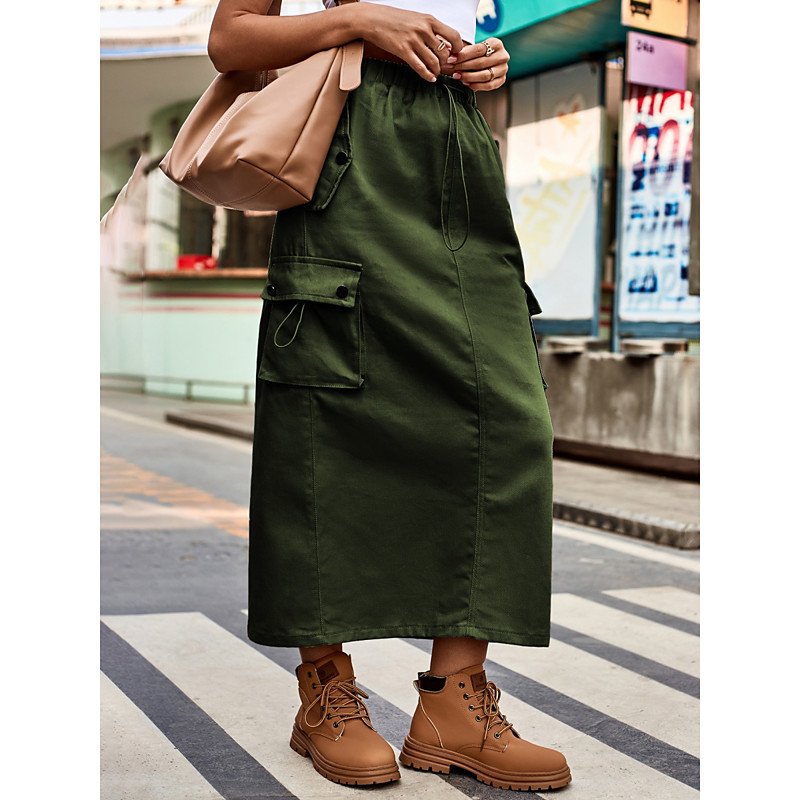 Women's Skirt A Line Fashion Casual Midi High Waist Skirts Plain Drawstring Pocket Micro-elastic Street Daily Black Army Green Khaki Light Grey Spring Cotton Blend Denim