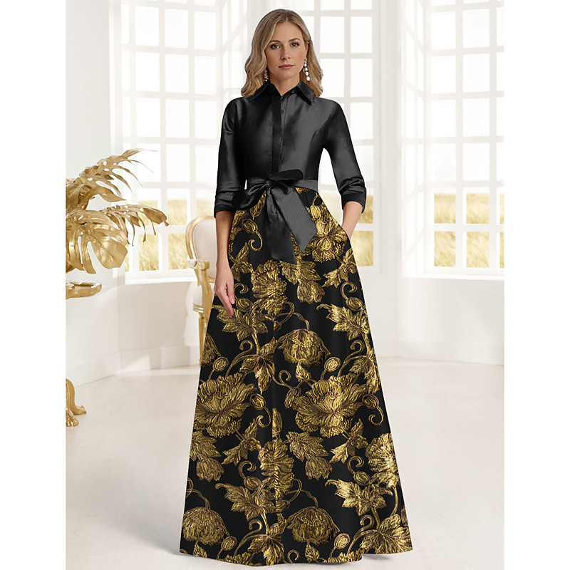 A-Line Floor Length Shirt Dress Formal Dresses Evening Gown Mother of the Bride Dress Long Sleeve Shirt Collar Elegant Vintage Formal Satin Jacquard with Bow(s) Flower