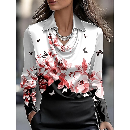 Per donna Camicia Floreale Grafico Elegante Casual Manica Lunga Scollo a Cascata Top Regolari Lavoro Abbigliamento da sera Quotidiano Arricciato Drappeggiato Rosso Blu Viola Verde Grigio Estate