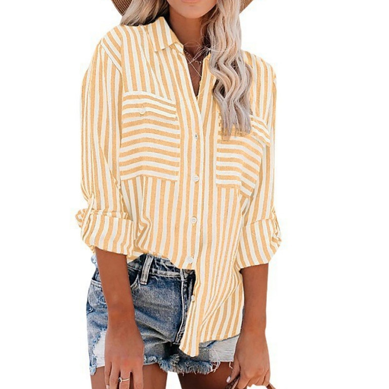 Women's Cotton Linen Shirts Striped Stylish Casual Long Sleeve Shirt Button Down Blouse Collar Regular Tops Daily Pocket Buttons Print Yellow Pink Blue Green Summer Spring Fall