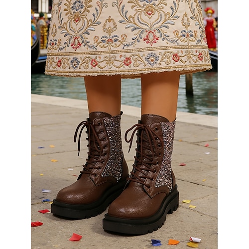 stivaletti con plateau per feste di carnevale da donna, stivali bordeaux con lacci e design a pannelli glitterati, stile vintage europeo da festival, suola spessa e comoda, ideali per sfilate di