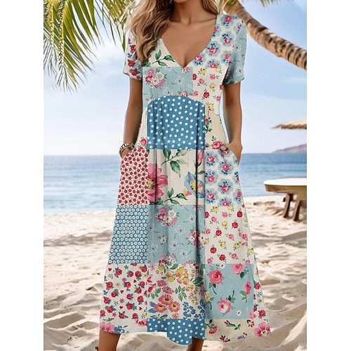 Per donna Abito Midi Vestito Casual Abito Floreale Elegante Moda Moderno All'aperto Vacanza Uscire Vestibilità comoda Floreale Manica Corta Scollo a V Verde chiaro Rosa Azzurro Estate Primavera