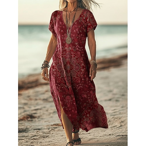 Per donna Abito lungo maxi Abito Boho Vestito Casual Abito a trapezio Abito Stampato Moda Moderno All'aperto Vacanza Weekend Vestibilità comoda Floreale Grafico Manica Corta Scollo a V Vino Verde