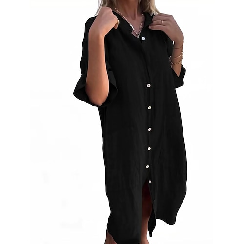 Per donna Abito Midi Abiti in cotone e lino Abito Camicia Vestito Casual Elegante Moda Moderno Quotidiano All'aperto Vacanza Vestibilità comoda Semplice Mezza Manica Colletto a Camicia Blu Nero Rosso