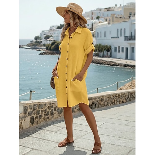 Per donna Abito al ginocchio Finto cotone e lino Moda Moderno Quotidiano All'aperto Vacanza Vestibilità comoda Semplice Manica Corta Colletto a Camicia Nero Bianco Giallo Verde Estate Primavera