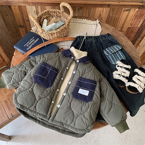 4 anni Ragazzi Giacca in piuma Giacca da esterno Capispalla Blocco di colori Manica Lunga Bottoni Tenere al caldo Cappotto All'aperto Quotidiano Essenziale Nero Verde militare Autunno Inverno Dai 4