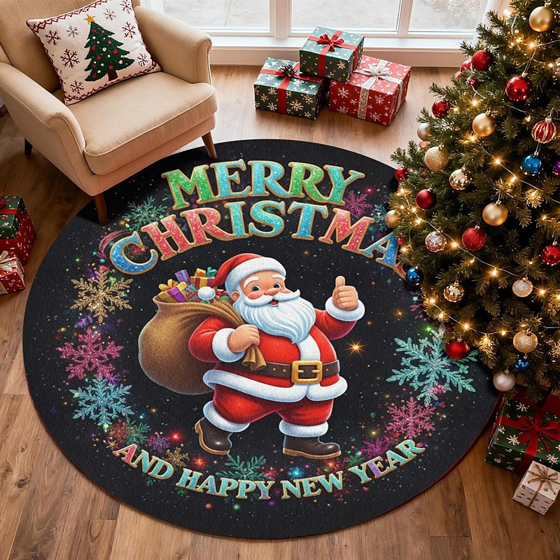 Santa Claus Merry Christmas Round Area Rug For Living Room And Bedroom, Faux Cashmere Xmas Carpet With Snowflake Pattern, Soft Non-Slip Machine Washable Rug, Holiday Decorative Floor Mat, 4ft