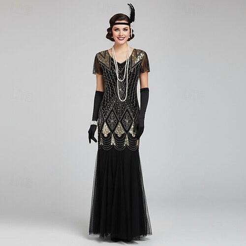 Set Anni Ruggenti Anni 1920 Abito da cocktail Lunghezza al pavimento Lunghezza al ginocchio Vestito Abiti Abiti da Ballo con accessori Maniche corte Il grande Gatsby Charleston Invitato al matrimonio
