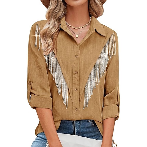 Per donna Camicia Tunica Camicia button-down Camicia casual Bottoni Frange Semplice Vintage Elegante Western Manica Lunga Colletto a Camicia Top Regolari Quotidiano Ferie Uscire Blu Nero Vino Cachi
