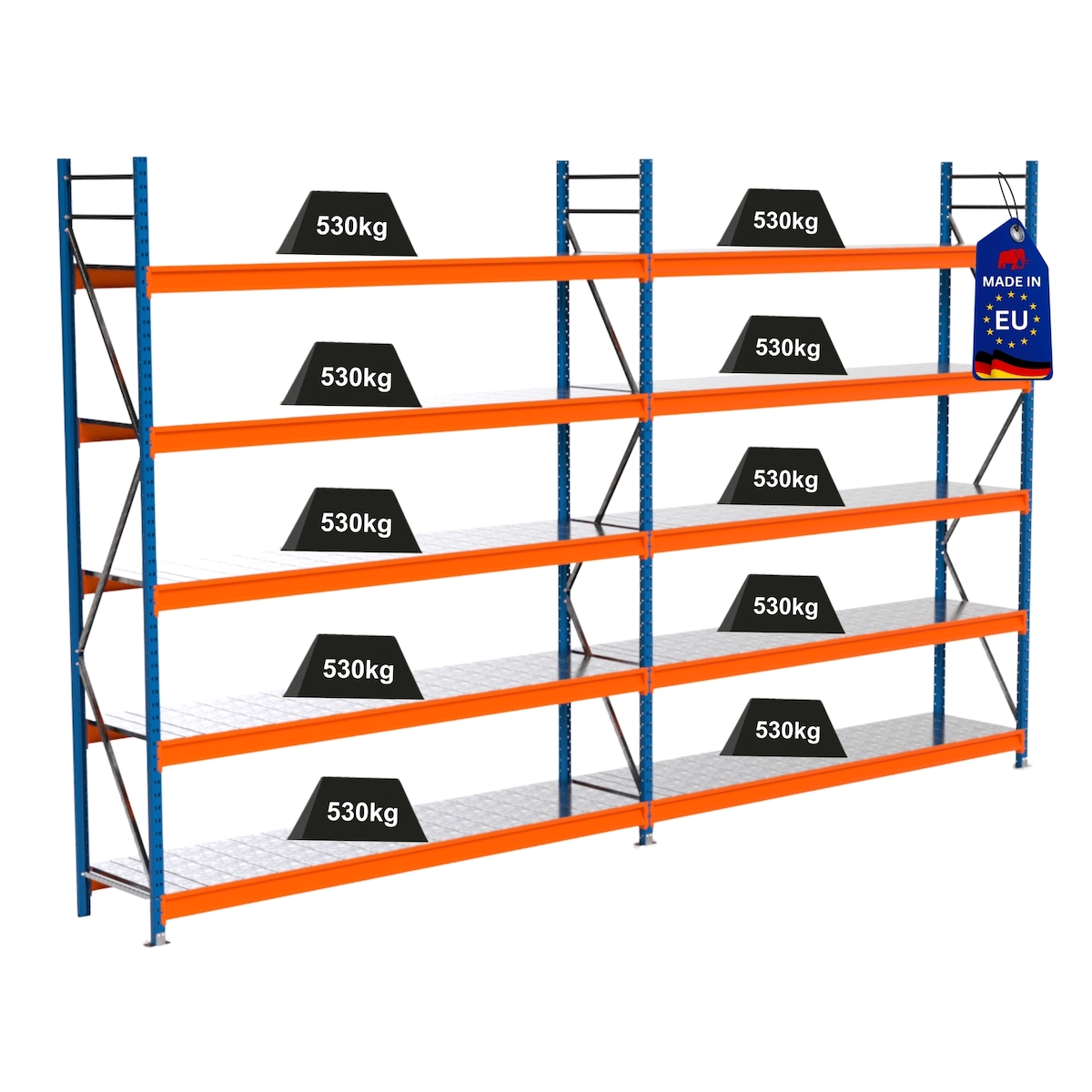 PROREGAL Industrie Schwerlastregal MAXIMUS PRO, Komplettregal, HxBxT 300x500x60cm, 5 Ebenen, Stahlplatten-Fachboden, Fachlast 530 kg, Blau/Orange