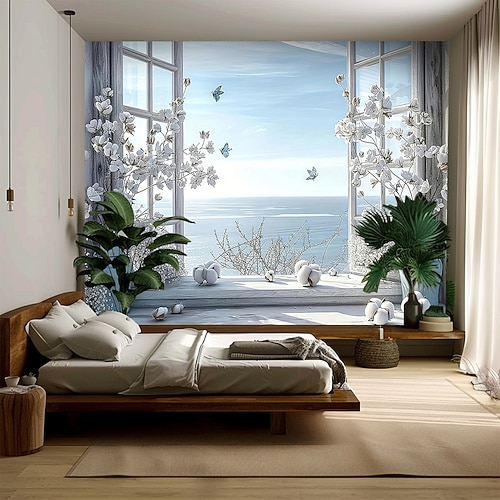 Arazzo da parete 3D con vista sul tramonto sulla spiaggia, dune di sabbia costiere, paesaggio oceanico, decorazione murale per camera da letto e soggiorno, sfondo artistico sereno.