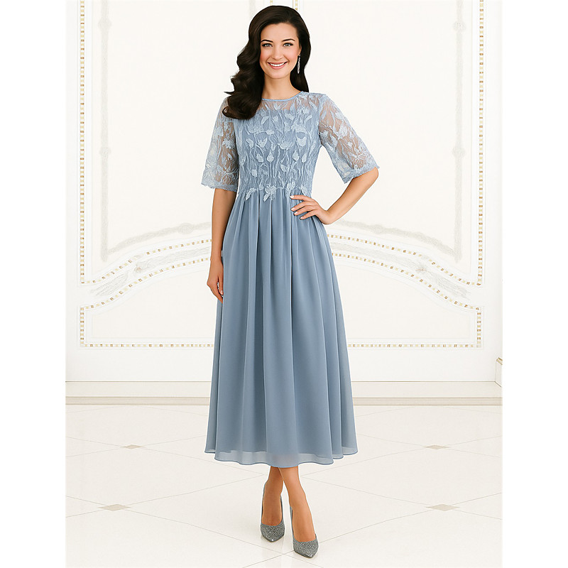A-Line Tea Length Party Dress Cocktail Dress Wedding Guest Dress Mother of the Bride Dress Short Sleeve Crew Neck Elegant Wedding Guest Engagement Party Chiffon with Appliques