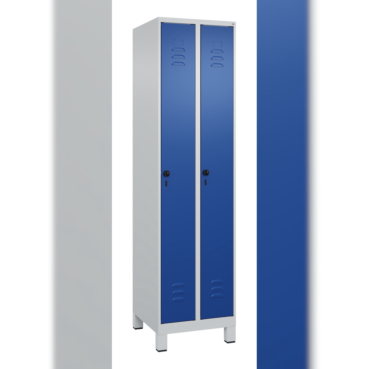 C+P Spind Classic PLUS, Füßen, 2 Abteile, HxBxT 195x50x50cm, Sicherheitsdrehriegel, Hellgrau/Enzianblau von PROREGAL
