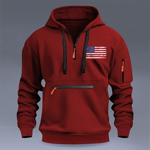 Per uomo Felpa con cappuccio Maglione Felpa con cappuccio e zip corta Blu Nero Vino Blu marino Cammello Con Cappuccio Bandiera Americana Tasca Stampato Quotidiano Sport Outdoor Sportivo Streetwear