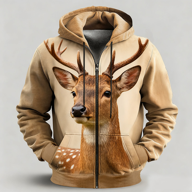 Men's Deer Hoodie Jacket Sweatshirt Fantasy All Over Print Zip Vacation Going out Streetwear Khaki Zipper Fall Winter Designer S M L XL XXL XXXL