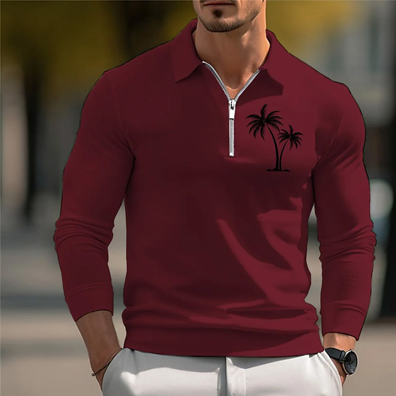 Men's Palm Tree Polo Long Sleeve Turndown Vacation Leisure Athleisure Casual Daily Zipper 3D Print Spring Fall Winter Navy Grey White