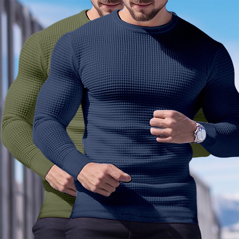 2 Piece Men's Waffle Shirt T Shirt Tee Top Long Sleeve Shirt Long Sleeve Crew Neck Crewneck Fall Spring Fall Plain Fashion Designer Basic Knitted Vacation Street Casual Top Tee for Men