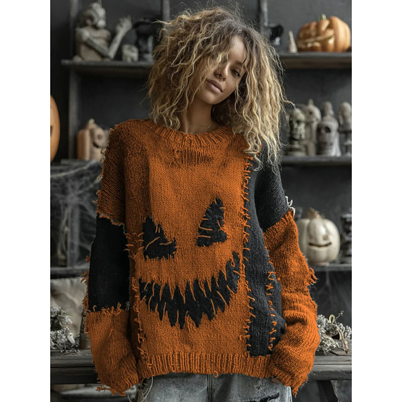 Women's Sweater Cute Streetwear Casual Graphic Pumpkin Crew Neck Patchwork Knitted Long Sleeve Regular Tops Knit Orange Green Fall Winter