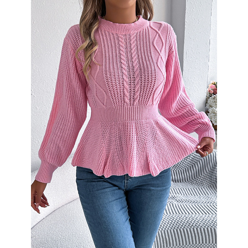 Women's Sweater Casual Solid Color Cable Crew Neck Knitted Long Sleeve Long Tops Knit Weekend Pink Fall Winter